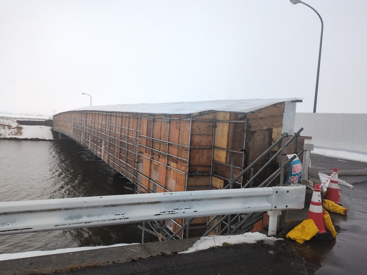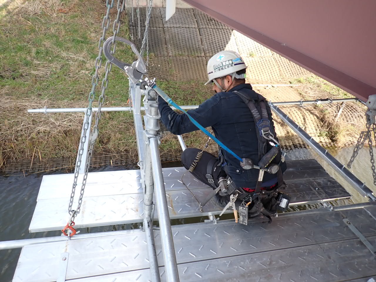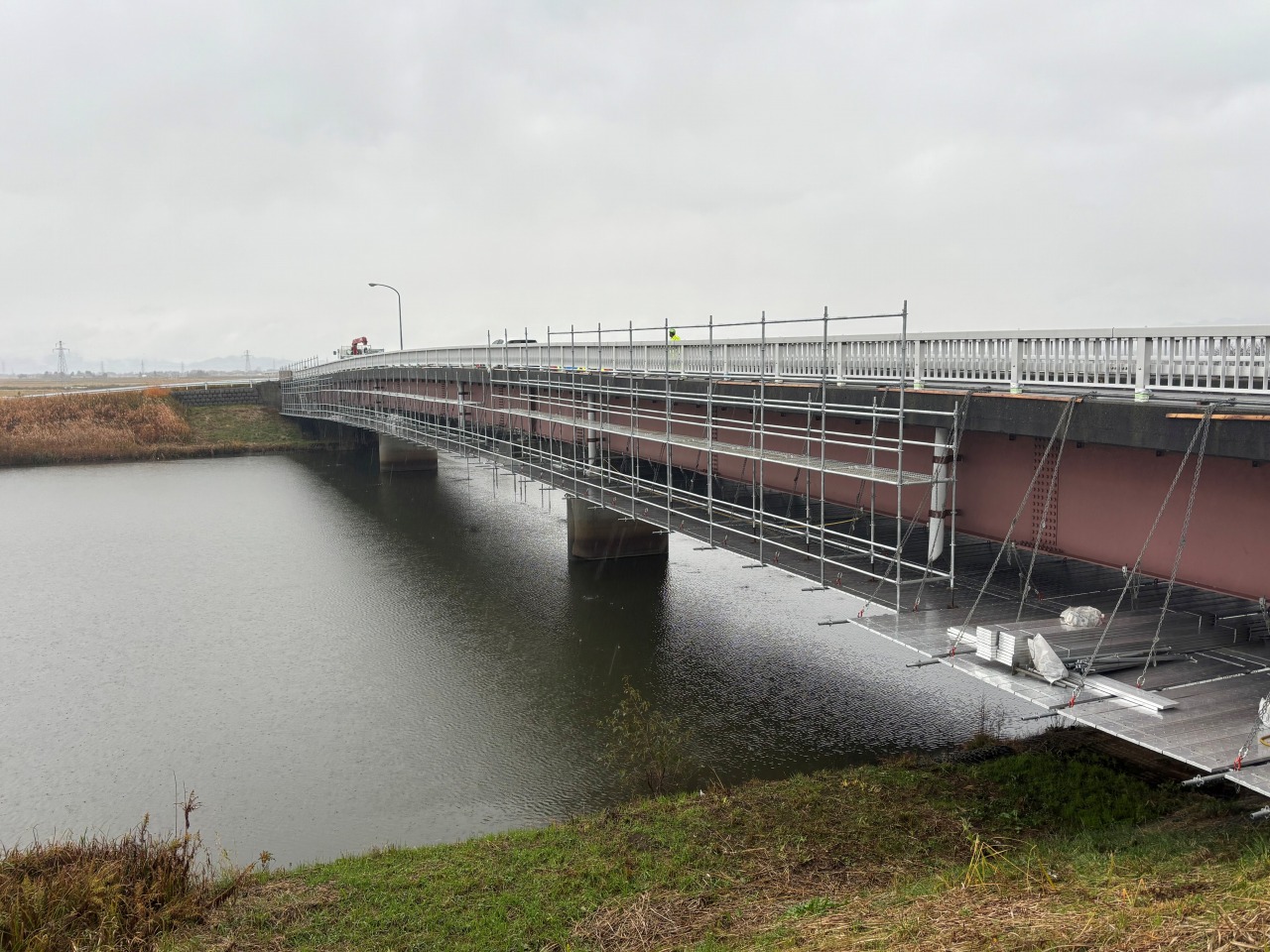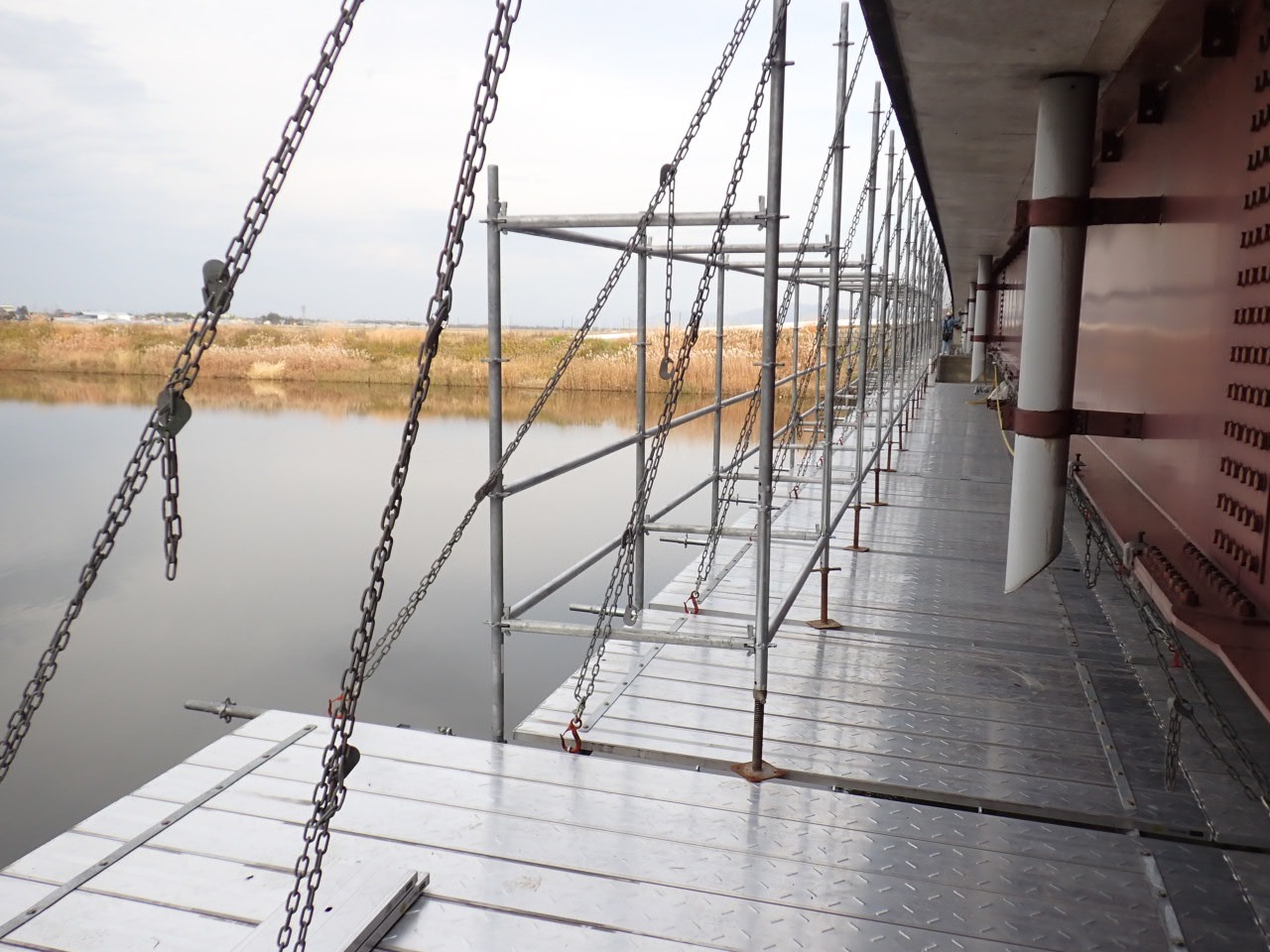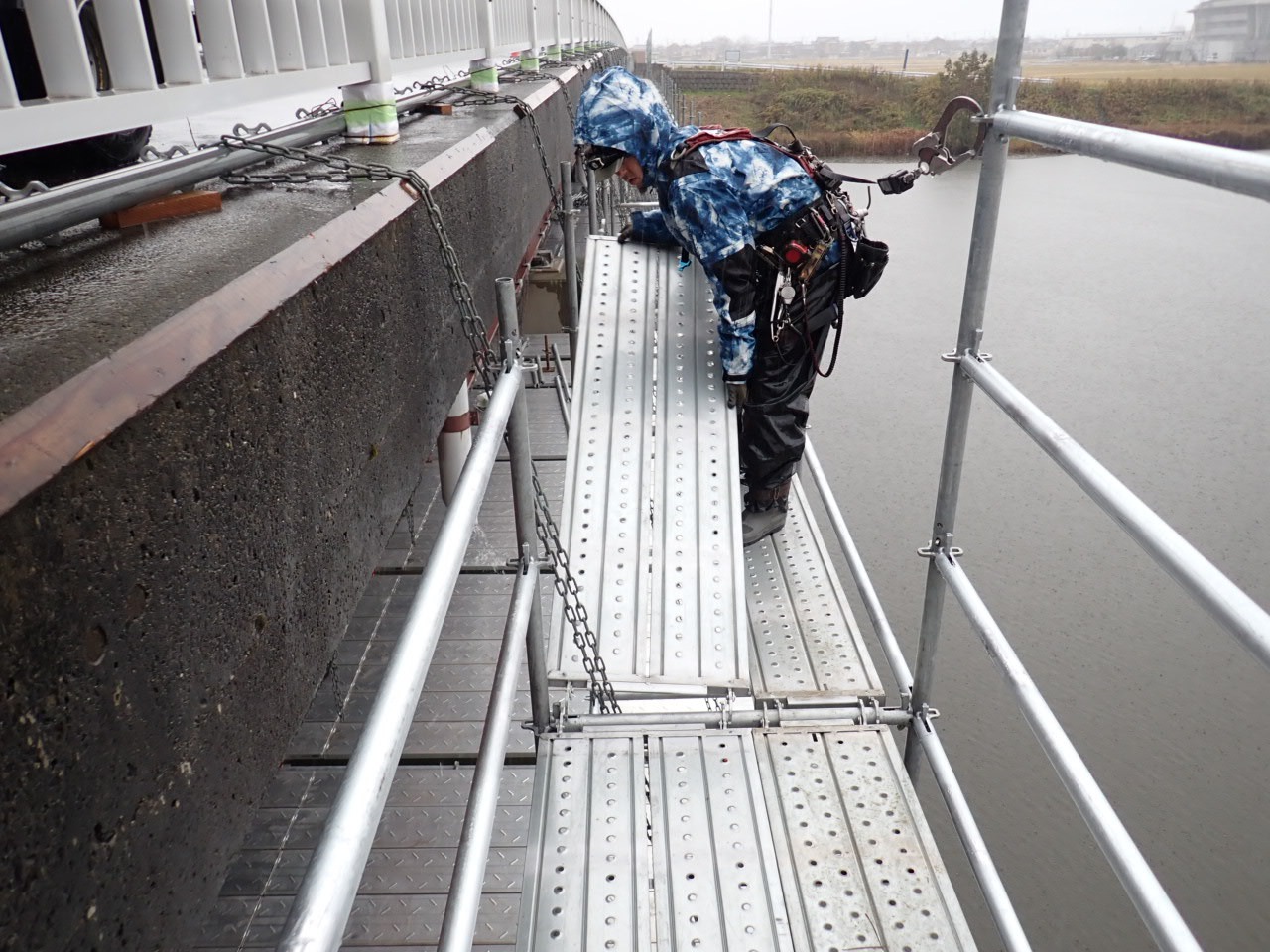 橋梁補修作業の為の足場を設置しています。