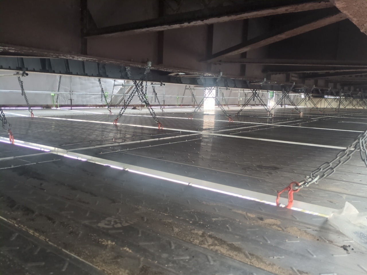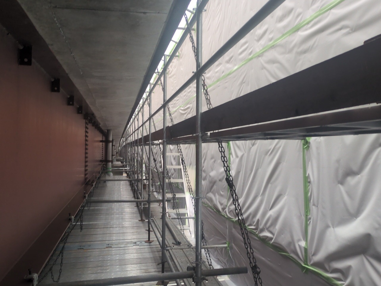 塗装塗替作業のために足場内のシート養生を行っていきます。